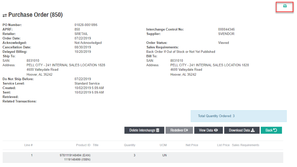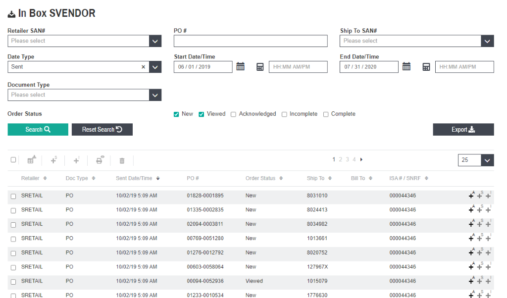 - Inbox is searchable by one or more filters: PO#, Retailer SAN, Ship-To SAN, Date/Time ranges