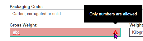 - If an invalid value is entered or required field is not complete, the field will be highlighted in red. Hovering over the triangle with the mouse will show what the issue is: