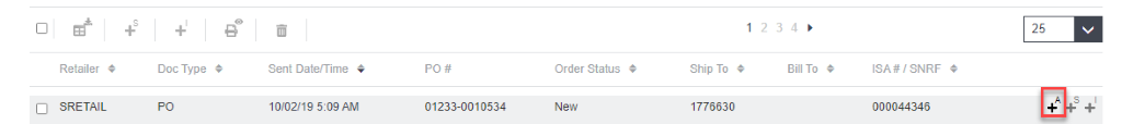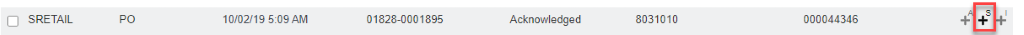 - Creation of response documents is done using the + icons on the end of each Purchase Order (PO) lines. The PO’s status will dictate what document type you can create and send and its “+letter” icon will be bold. The For example, if the PO’s status is “New” or “Viewed,” the +A icon (POA) will be bold and the +S and +I will not be bold.