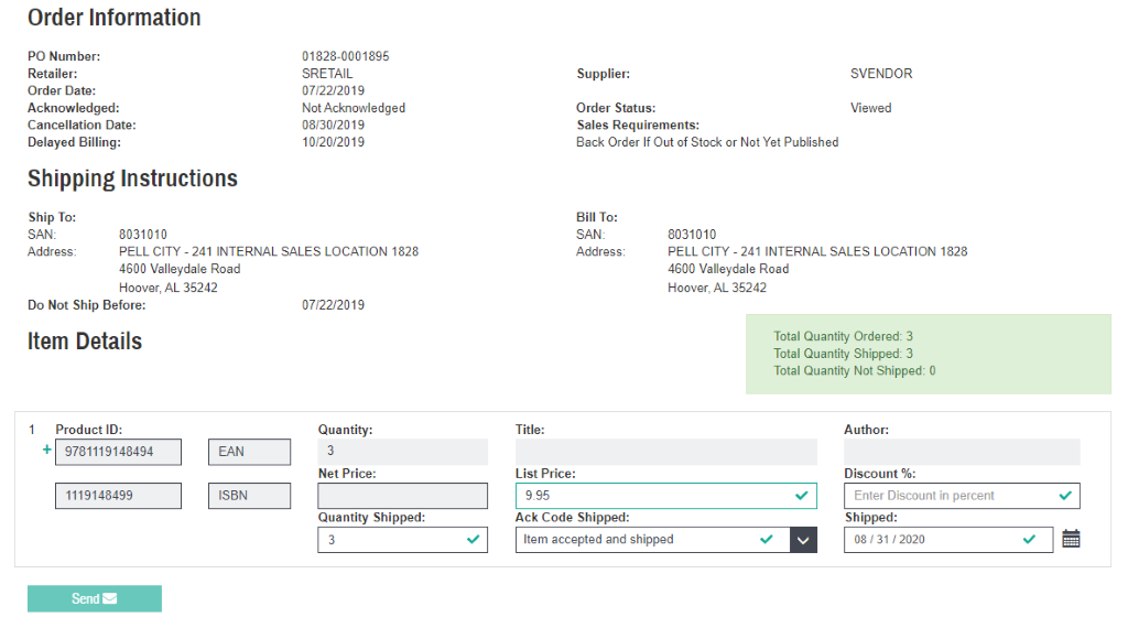 - If Order can be shipped today for the quantity ordered for all the line items, then nothing needs to be changed on the form and the Send button can be clicked.