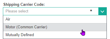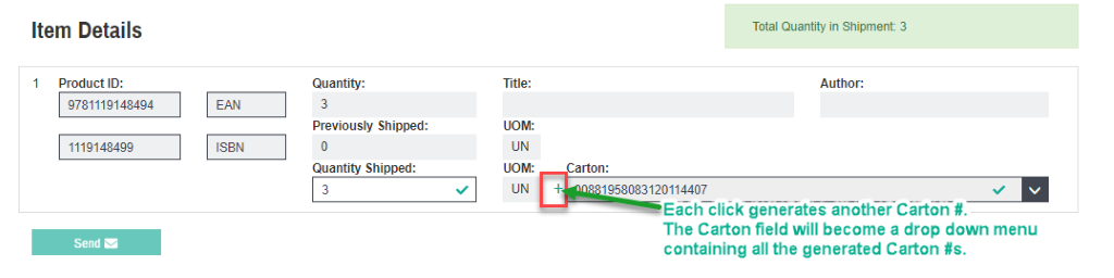 >> To generate additional Cartons/Numbers, click on the “+” in front of any Carton field. The Carton field will become a drop down menu field containing all the generated Carton numbers.