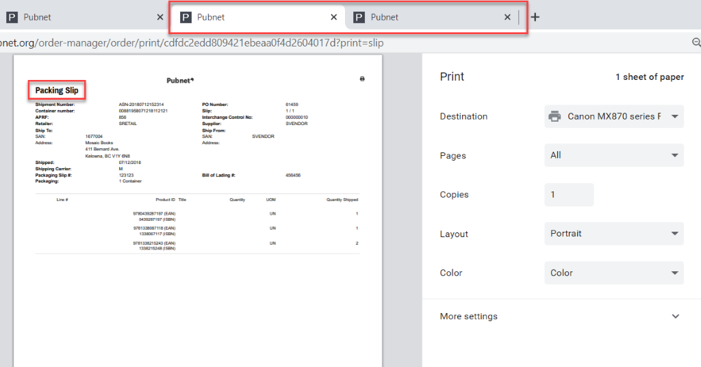 >> Two new tabs on the browser window are added; one for Packing Slips and one for Shipping Labels. One of the tabs will open showing the Print dialog box. Below is shows the Print dialog box for the Packing Slip(s). Finish the Print setup, select the appropriate printer and print the documents (packing slips). Close the window. The second tab will open with the Print dialog box for the other documents (here it will be the Shipping Labels). Finish the Print setup, select the appropriate printer (for shipping labels) and print the documents. Close the tab for shipping labels.