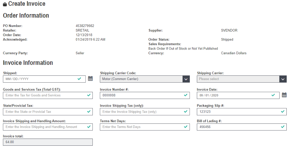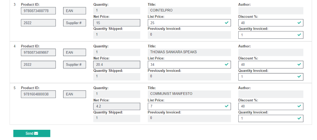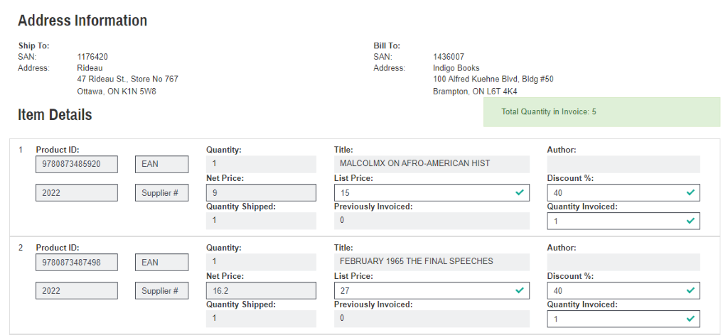 - The Invoice is optional (except for BookNet Canada) and is sent after the Purchase Order Acknowledgement (POA) or Advanced Shipping Notice (ASN). Confirm with Bookseller they can accept the Invoice before creating/sending it.