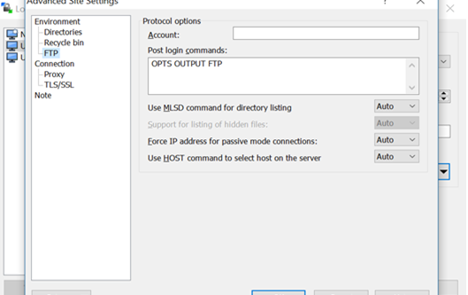 - Click on the 'Advanced' button to enter the post login command OPTS OUTPUT FTP under 'Environment' - 'FTP' as in the screenshot below